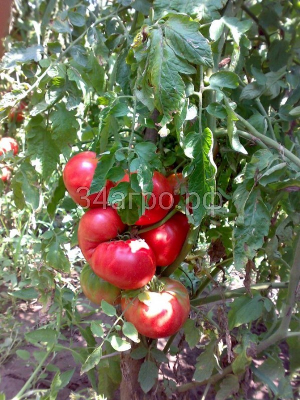 Популярный, крупноплодный, любительский, среднеранний (125 дней) сорт для пленочных теплиц и открытого грунта. Плоды малиново-розовые, плоско-округлые, крупные, мясистые, массой 200-300 г (отдельные - до 700 г). Урожайность 2,5-3,0 кг с растения.